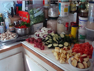 One of the dinners we make is a Kabob Dinner Deluxe, and here is half the pile of food I cut up for it You will also notice in this picture the small size of our kitchen- what you are seeing is 1/2 the total space in there: